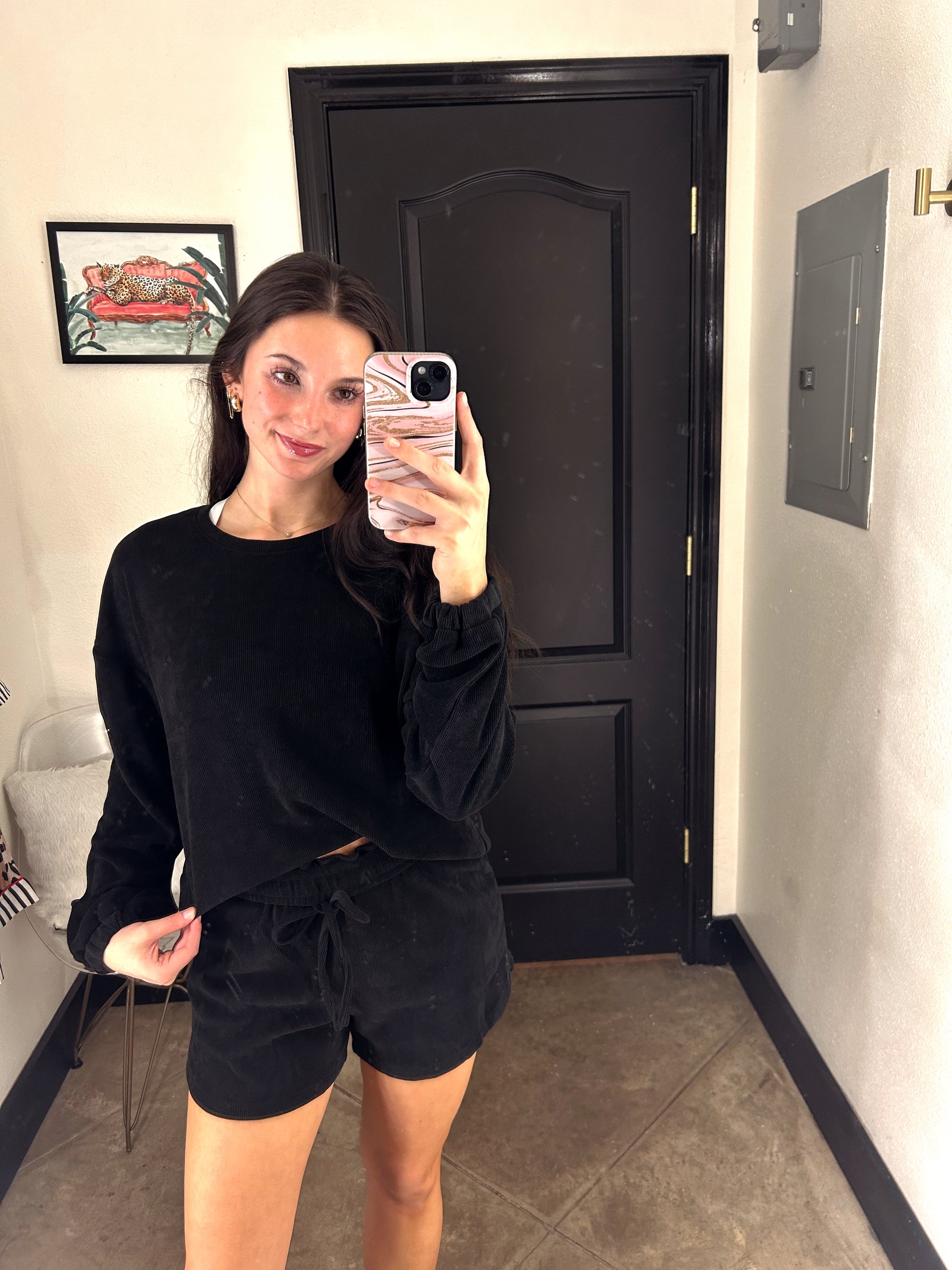 Ribbed black sweatshirt with matching shorts.
