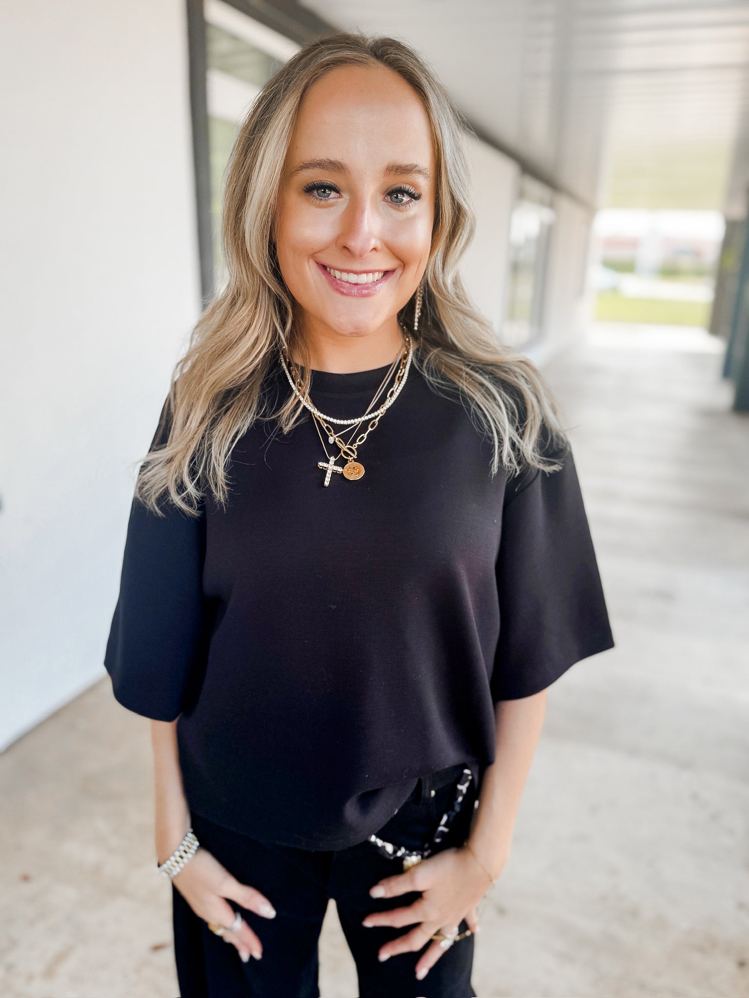 Double knit drop shoulder scuba top. Runs true to size- modeled in small
