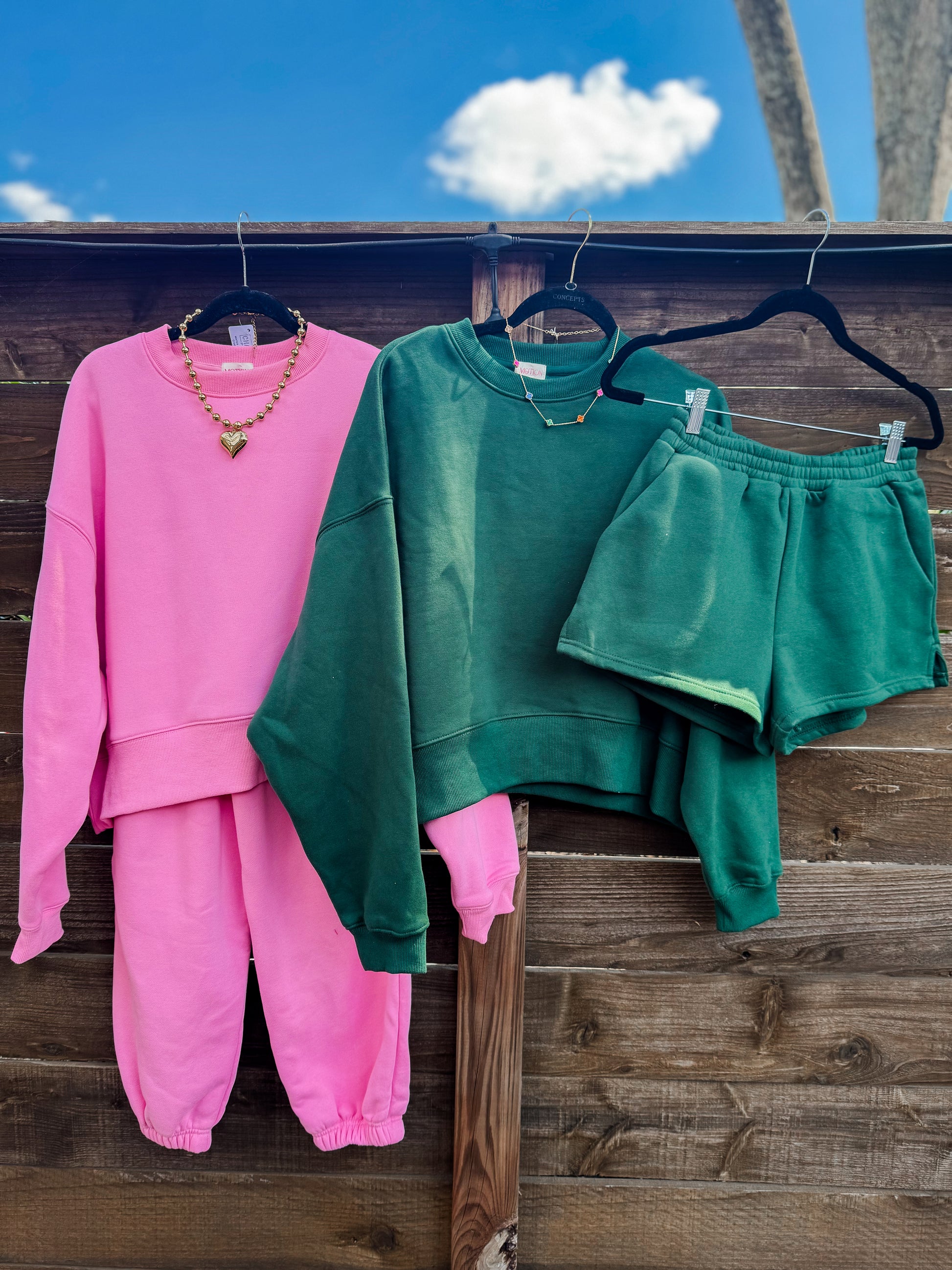 cropped sweatshirt with matching shorts. The shorts have pockets.