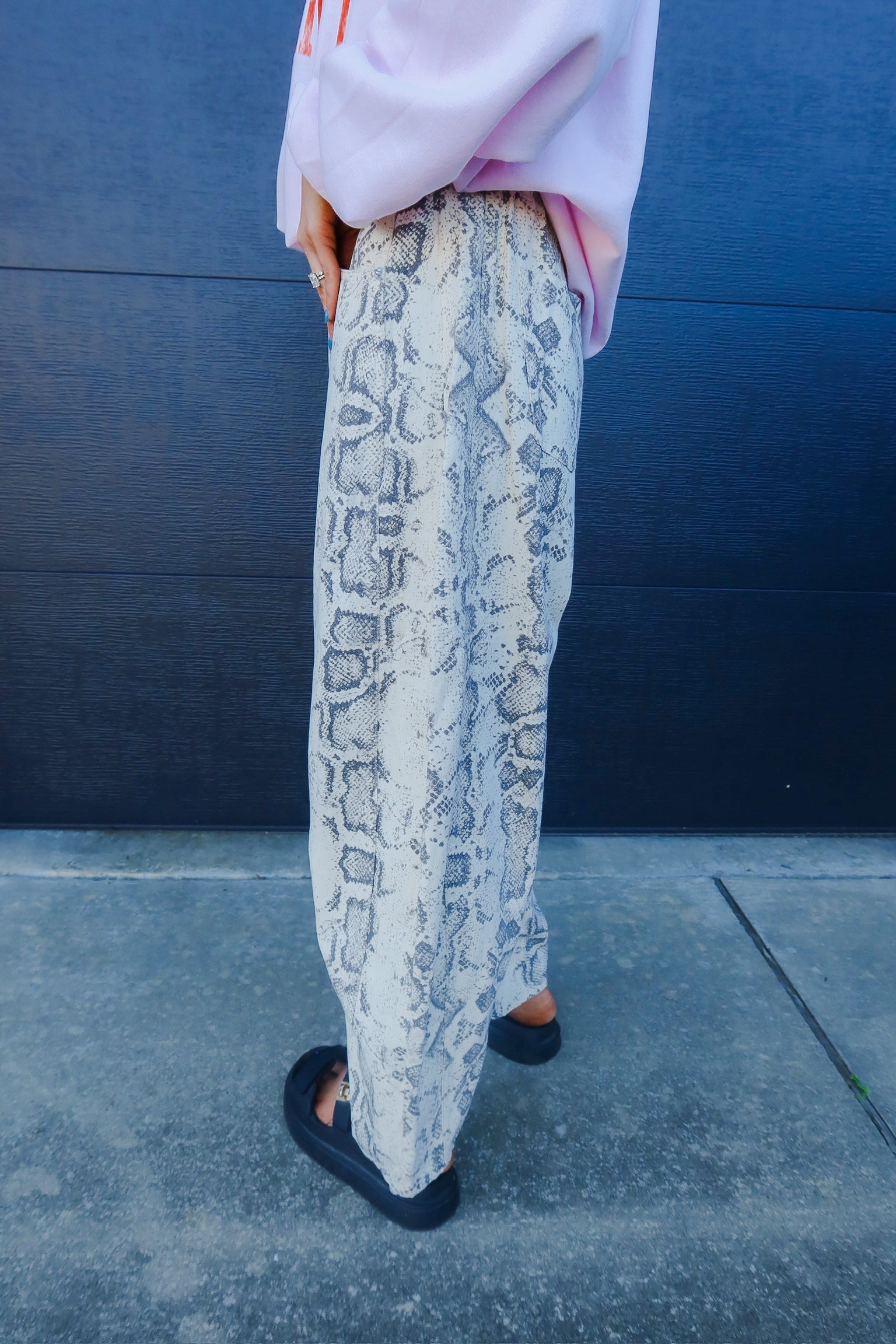 Relaxed pull-on barrel denim pants with snake print, elastic waistband and side pocket detail.