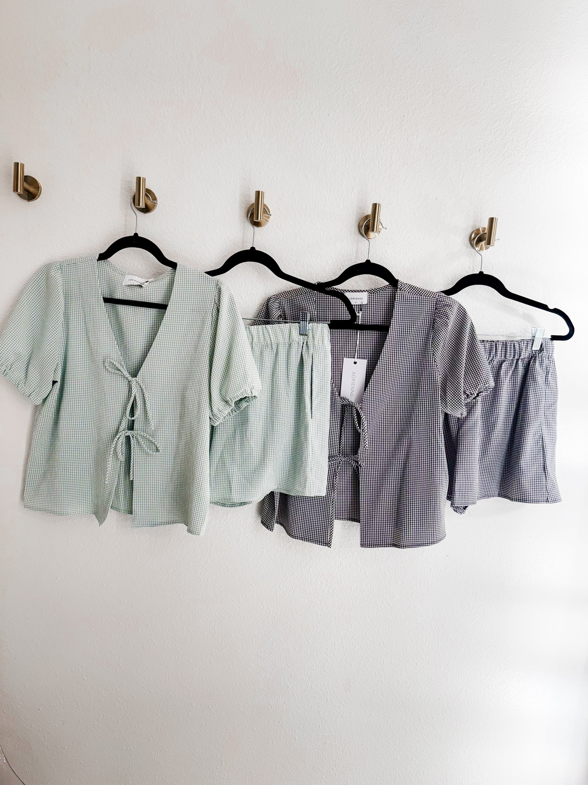 Tie front blouse with matching woven shorts with pockets. Runs true to size